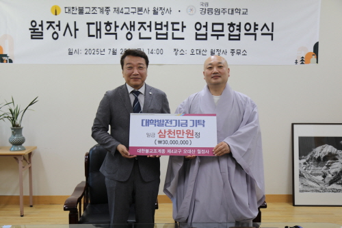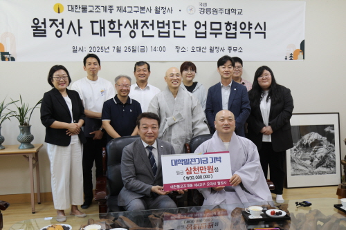 대한불교조계종 오대산 월정사는 7월 25일(금) 오후 2시, 국립강릉원주대학교(총장 박덕영)와 업무협약을 체결하고, 대학 발전을 위해 총 3천만 원의 발전기금을 전달했다.